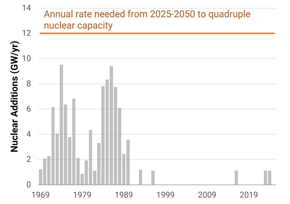But quadrupling U.S. nuclear capacity by 2050 means building 1.5x that every year for the next 25 years.