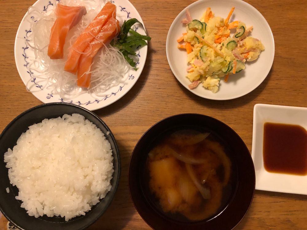 今日は、白ごはん、玉ねぎとお麩の味噌汁、サーモンの刺身、ポテトサラダ、でした。
