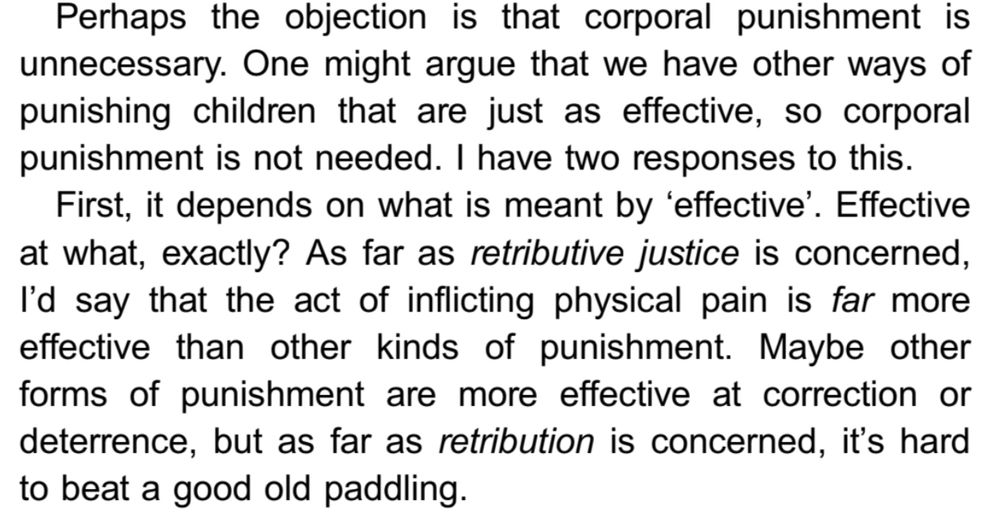 Ikke bare er det viktig for ham at foreldre hevner seg på barna sine for ulydighet, dette bør gjøres selv om barna tar skade av det. Dette er altså det Aftenposten omtaler som en "ekspert" på straff. En som forsvarer vold mot barn fordi volden er viktigere enn barna.