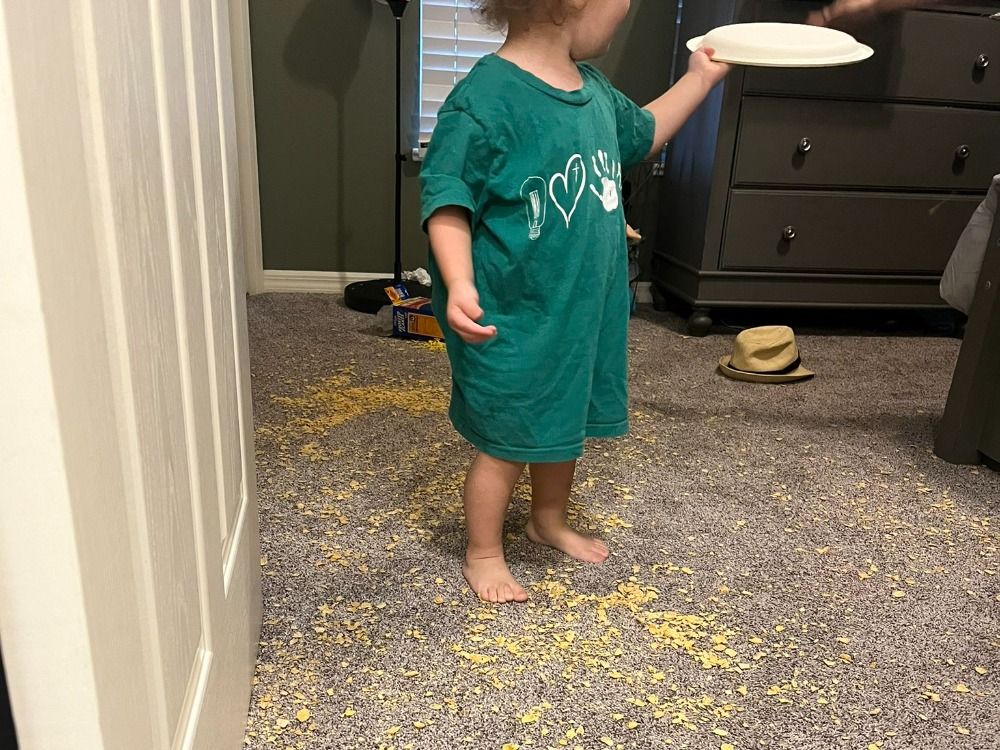 Here’s a photo of my son leaving Frosted Flakes all over his brother's room.