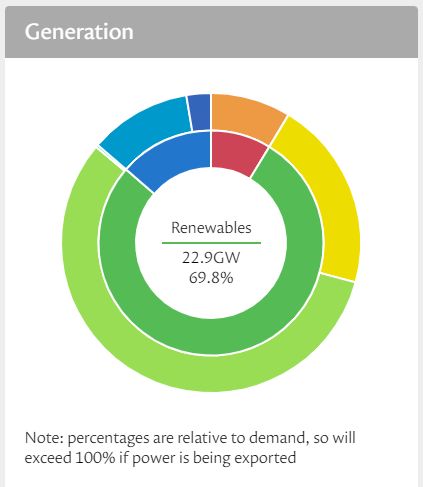 At the moment, renewables are generating almost 70% of the UK's electricity demand. Ok it's both windy and sunny today, but this is not unusual. In fact over the last week (nights included!) renewables have contributed > 50% of our electricity.