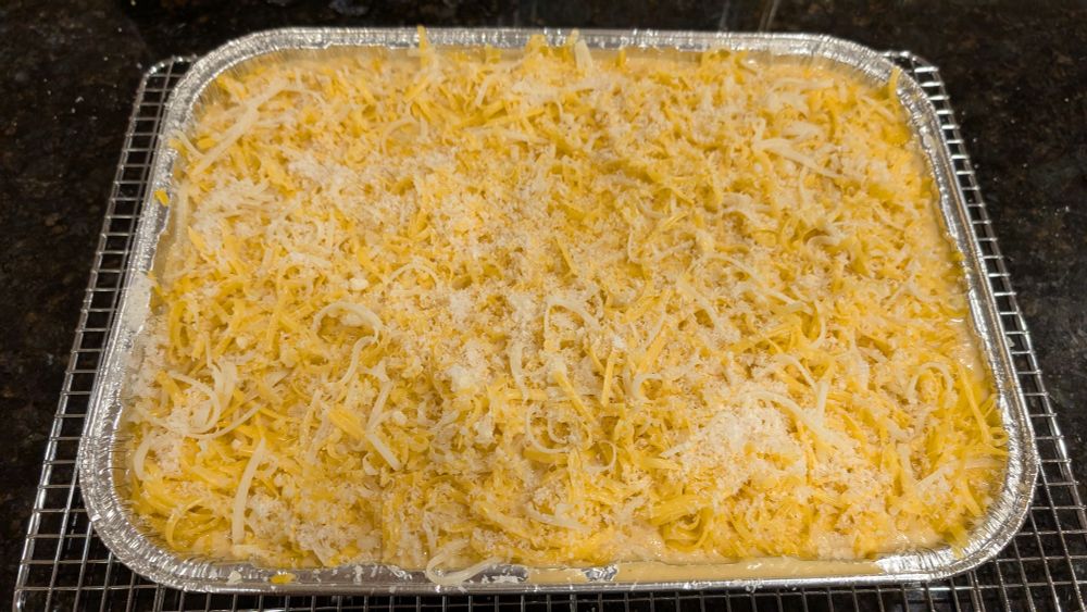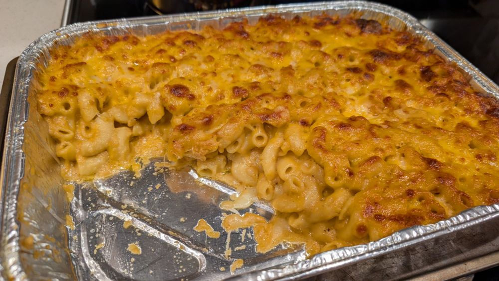 It's 2.5+ pounds of cheese to one pound of noodles. But because of its base of evaporated milk, it doesn't sit like a brick. And the chicken bouillon, mustard powder, & cayenne punch up its flavor.