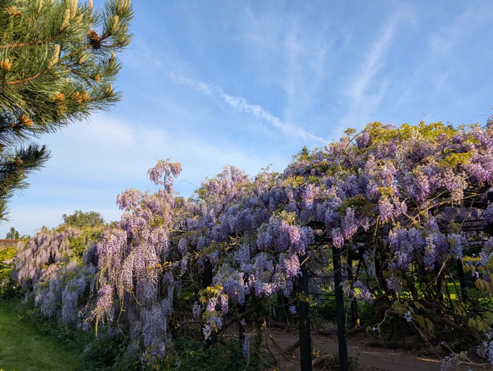 Pinces Gardens, in Exeter. 150 years old, and often said to be the second longest wisteria arch in the country (citation needed!). Some years, local residents have held a little fair in the park to celebrate it flowering by drinking tea, watching a puppet show, etc. It smells wonderful too!