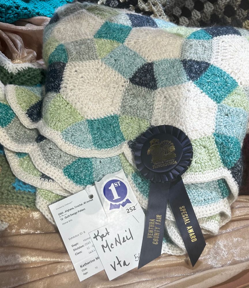 #crochet lovers. Disappointed with the results at our local county fair. My blanket won special award ribbon. They explained it as it was better than first place but they had to many for the categories of nominated for best of show and best of show. Grandma crochet caddy took a first.