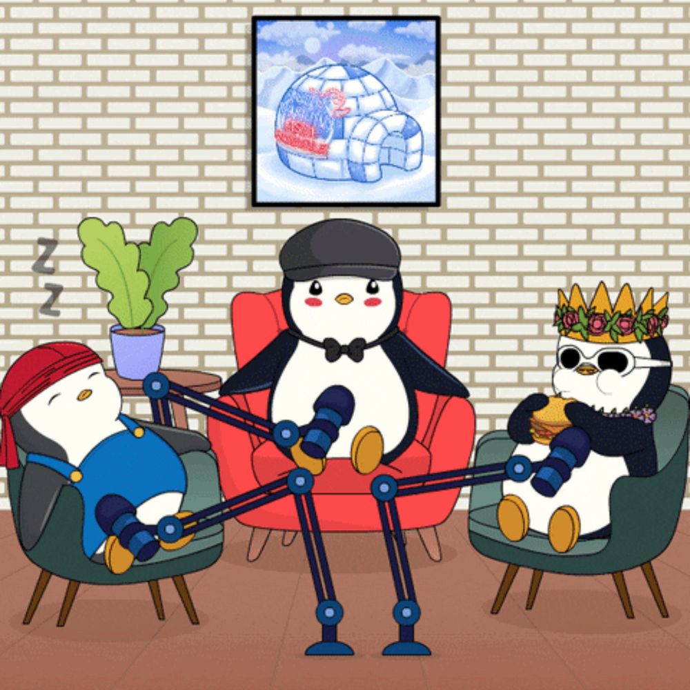 ALT: three penguins are sitting in chairs in front of a painting of an igloo with the word iceberg on it