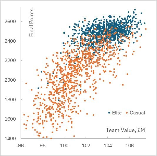 By GW24, elite squads were worth £2.7M more than casuals’ — and that gap showed in the final standings 📈