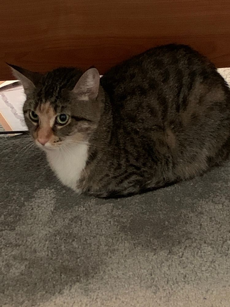 Mocha is getting braver! Day 3. Of course she had to be dragged out from behind the filing cabinet, but she is sitting here rather than rolled in a ball.