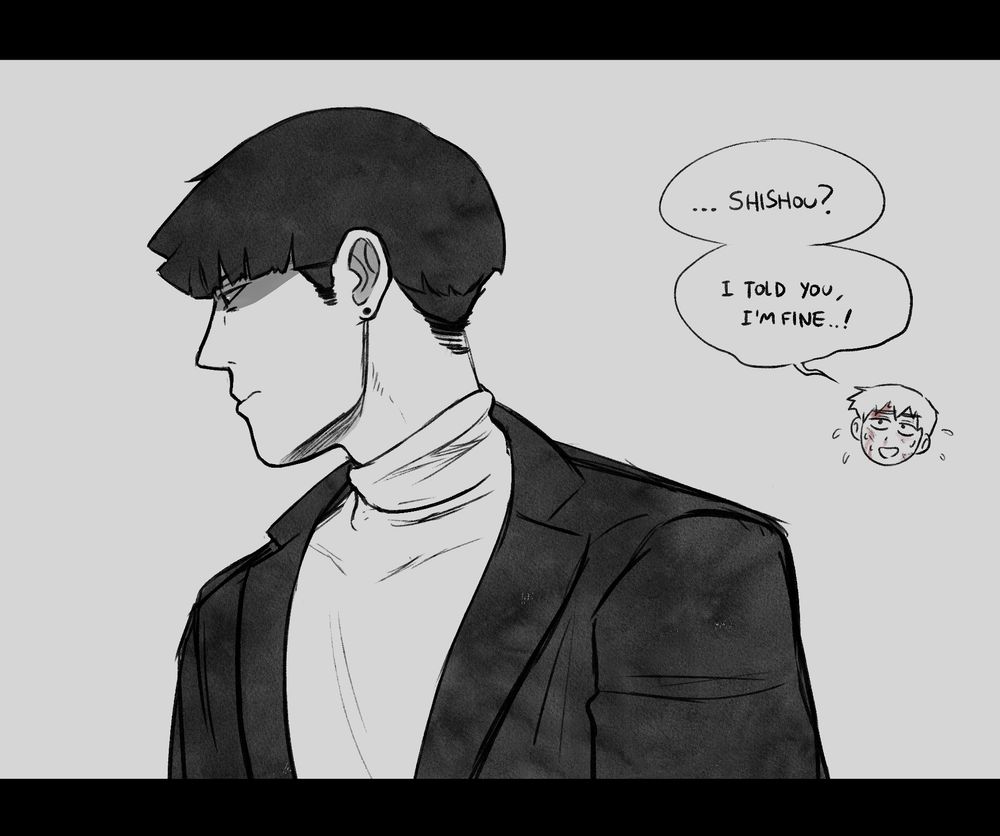 “Thank you,” Reigen says, a little dazedly, before he remembers himself and his eyes dart to the other side of the table. Mob is staring back unreadably. He’s not eating his fries anymore.