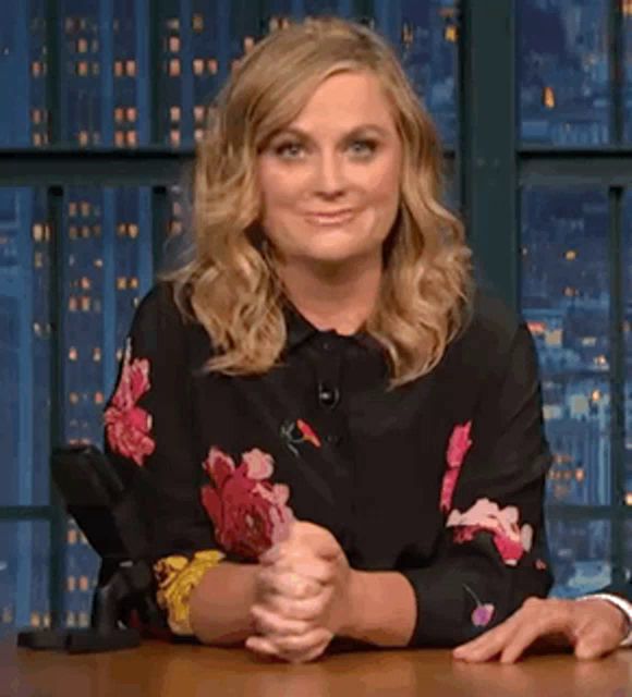 ALT: a woman is sitting at a table with her hands folded in front of her .