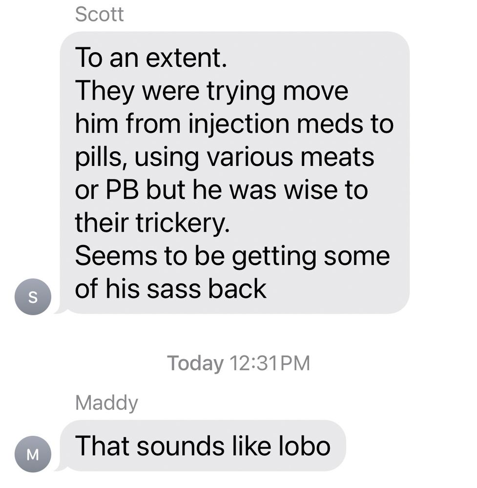 #loboblanco is cleared to go back to normal Lobo stuff, which right now is sleeping off the drugs.