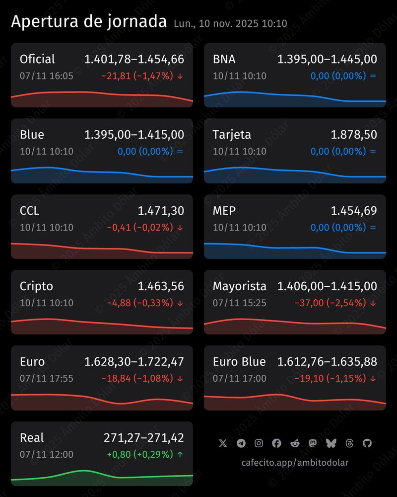 Apertura de jornada. OFICIAL: 1.454,66 (-1,47%), BNA: 1.445, BLUE: 1.415, TARJETA: 1.878,5, CCL: 1.471,3 (-0,02%), MEP: 1.454,69, CRIPTO: 1.463,56 (-0,33%), MAYORISTA: 1.415 (-2,54%), EURO: 1.722,47 (-1,08%), EURO BLUE: 1.635,88 (-1,15%), REAL: 271,42 (+0,29%).
