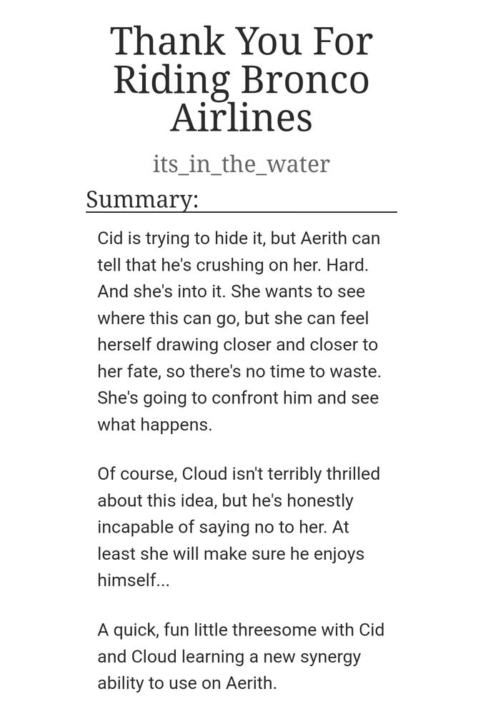 Tried something new with an #AerithGainsborough / #CidHighwind / #CloudStrife fic, because I'd never seen one before lol