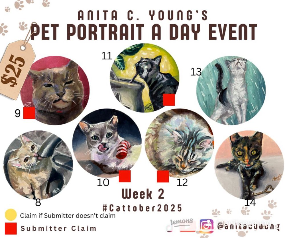 Here’s the claimed and the unclaimed paintings so far! I am trying to get the first batch of paintings out this weekend! Maybe I’ll even be able to do a packing video (don’t hold your breath though!). Submitter hold are up on November 7th #cattober2025 #kattober2025