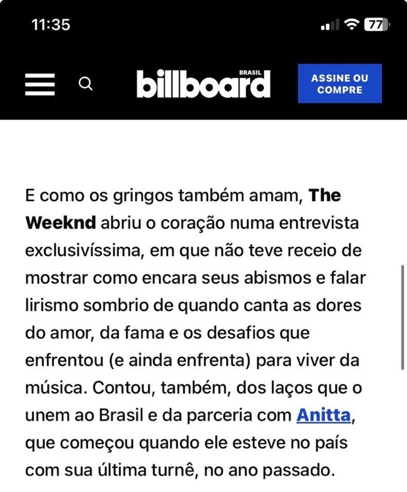 "Contou, também, dos laços que o unem ao Brasil e da parceria com Anitta, que começou quando ele esteve no país com sua última turnê, no ano passado."