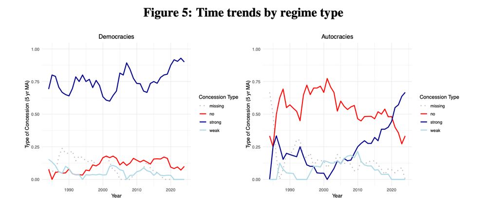 Graph below shows that democracies always have high concession rates. Autocracies have historically had high rates of NO concessions, but recently have seen a *big increase* in strong concessions. The recent global increase in strong concessions is partly driven by trends in autocracies /15
