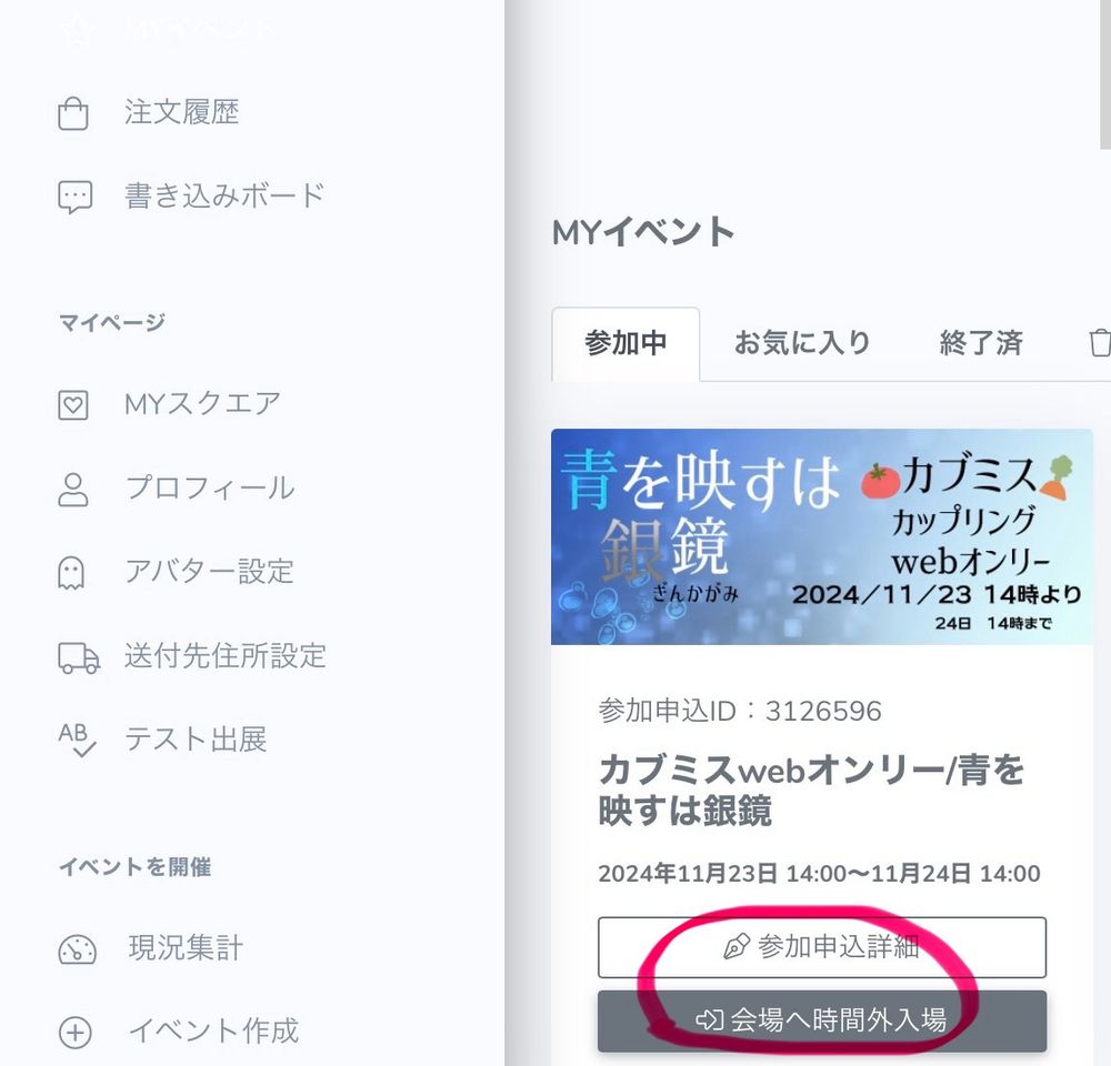 ①先ほど同様MYイベントから参加申し込み詳細へ