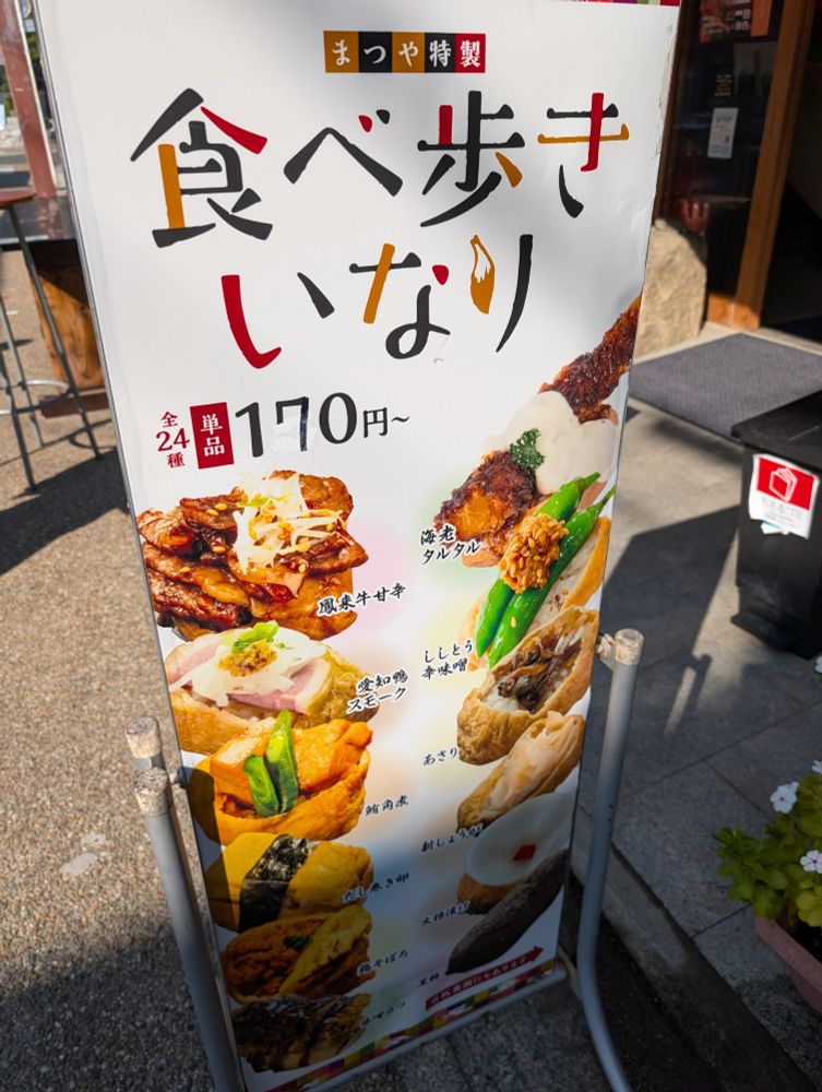 今日のおやつ その2は釜出いなり、柚子、おきつねあげ。しみしみなおいなりさんも良かったけど、分厚いおあげさんは衝撃。美味しい。創作いなりのお店で、写真の看板はメニューの一部。もっとたくさんありました。水瀬伊織もお仕事してました。(豊川創作いなり寿司 和食処 松屋)