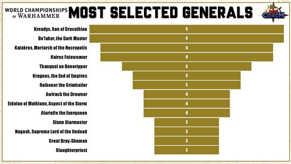 Next is our Manifestation choices, Manifestations by Grand Alliance, Most Popular General selected, and most common Wizards & Priests selected.