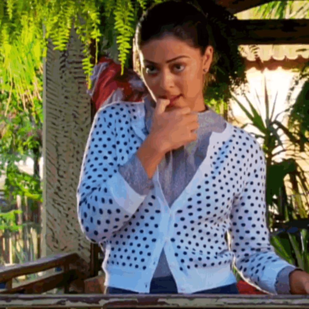 a woman wearing a white and black polka dot cardigan holds her finger to her mouth