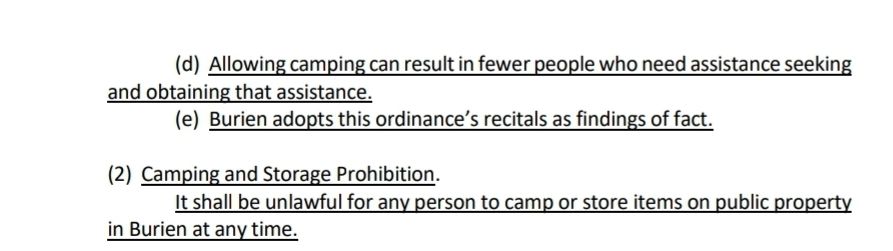 The city of Burien, WA is proposing an absolute ben on homeless people sleeping anywhere in the city, including in vehicles. The lengthy whereas section argues that homeless people just need a threat of jail to go into shelters (which do not exist in Burien and are limited and inadequate elsewhere.)