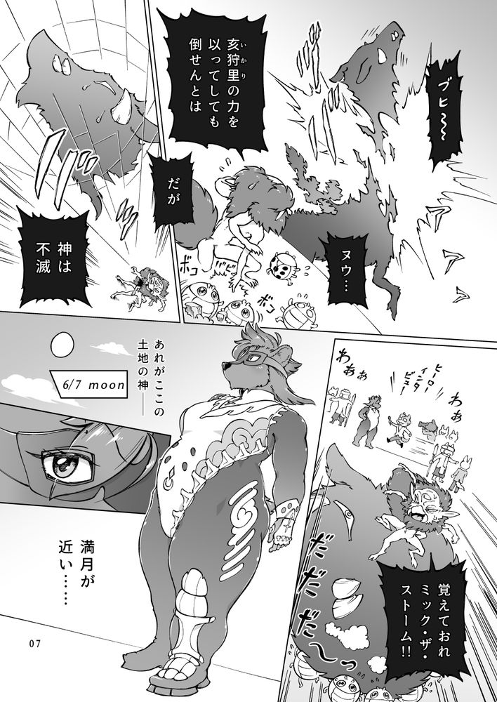 最強無敵のデカムチメスケモ熊闘士が満月の光に狂わされ、巨大な怪獣と、小柄な爺と生交尾!一晩で身も心も溶け合って、デキるモノまでデキちゃいます。