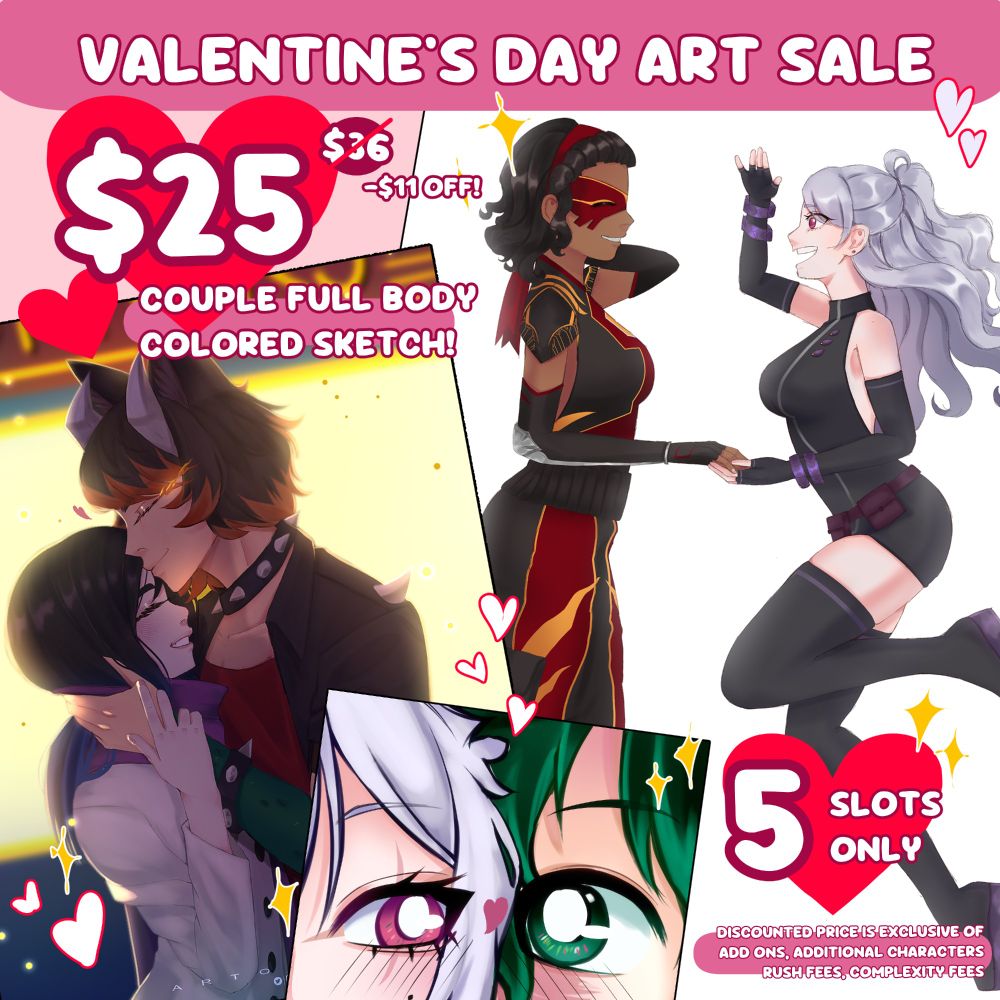 hello! ✨ im opening 5 slots for my $25 couple full-body colored sketches! 💕 promo ends on the end of feb or when the slots run out 🥰