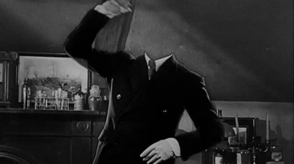 ALT: a man without a head is standing in a room