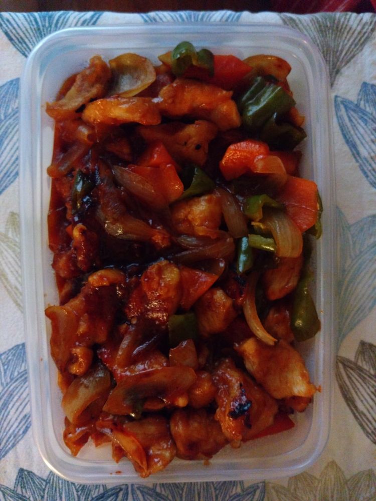 酢鶏、炊き込みご飯、ゆでたまご、じゃがいもとちくわの煮物。