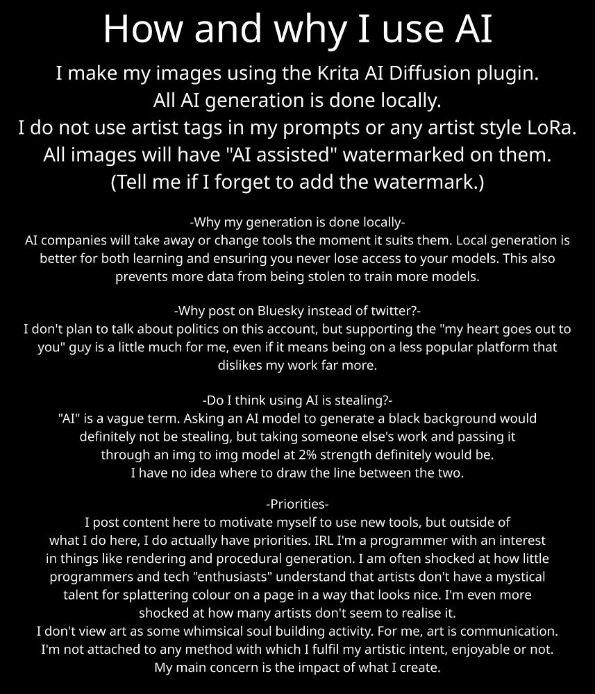 Bluesky doesn't have a setting to mark all posts as NSFW, so I might swap to only posting previews here and starting a patreon. The NSFW versions will still be available FOR FREE. I might have to lock it behind patreon's "free membership" thing due to adult content guidelines though.