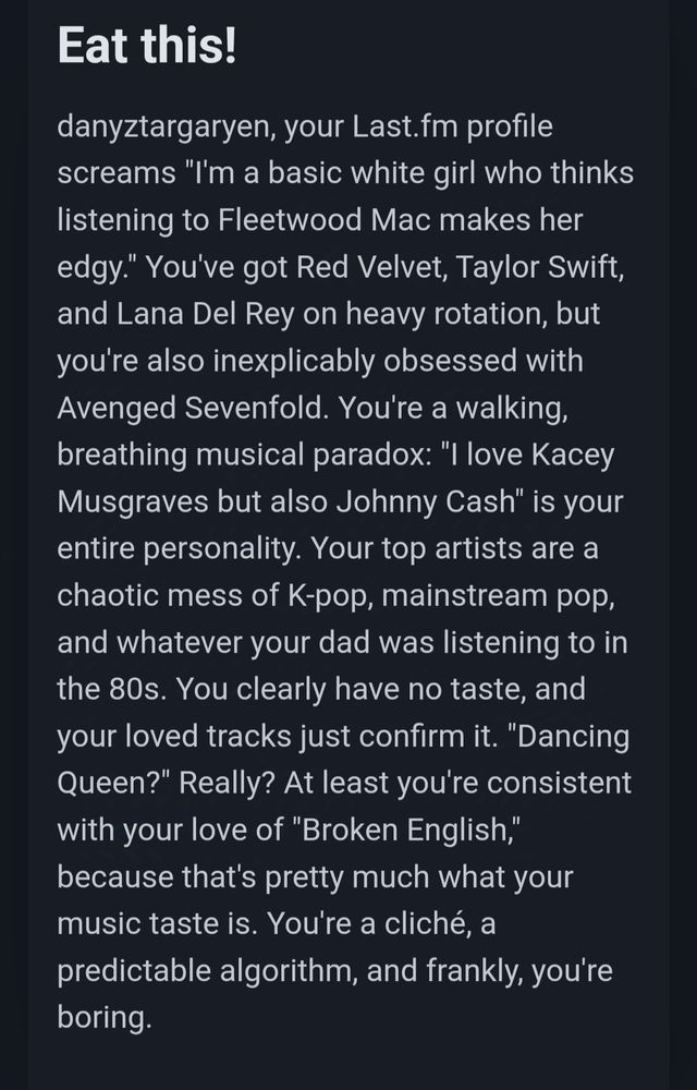 "Your taste is as chaotic as the Targaryen family history." mirou na humilhação e acertou no elogio
