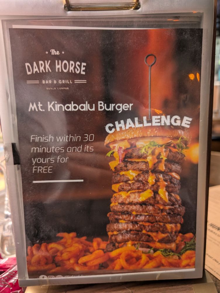 At Dark Horse Grill in #KualaLumpur and saw this eating challenge. 10 patties, plus the fries. Absolutely not. And for dessert, after failing the challenge: Diarrhea.