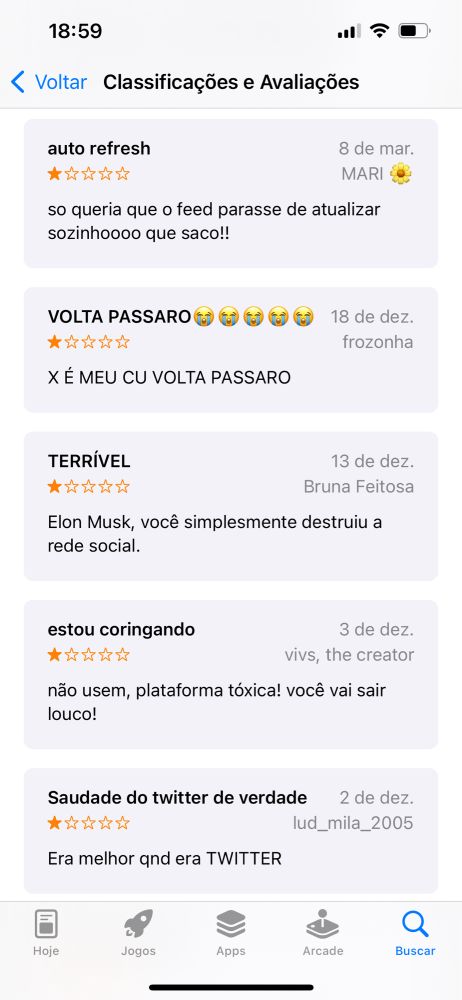 Fui olhar as avaliações do Twitter na App Store e tem gente coringando há tempos kkkkk