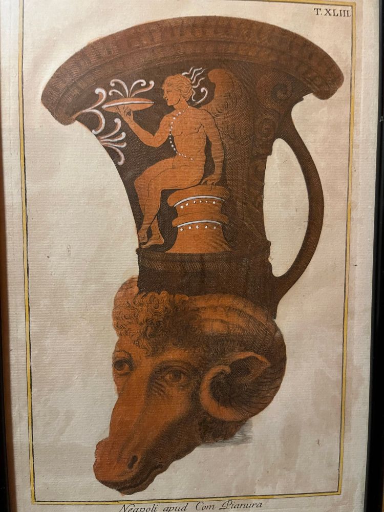 Surprising classical urn art in a restaurant washroom. What's with the ram's head? Is it part of the urn or something the urn tests upon? And if that's a steaming plate of food, is the Angel's head steaming as well? Or just smelly? Is his angel sense tingling?