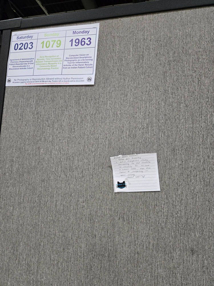 How fun after waking up at 345am for a super early super bumpy flight to walk into #ACR24 and find a delightful note from @rheumcat.bsky.social at my poster spot! ♥️