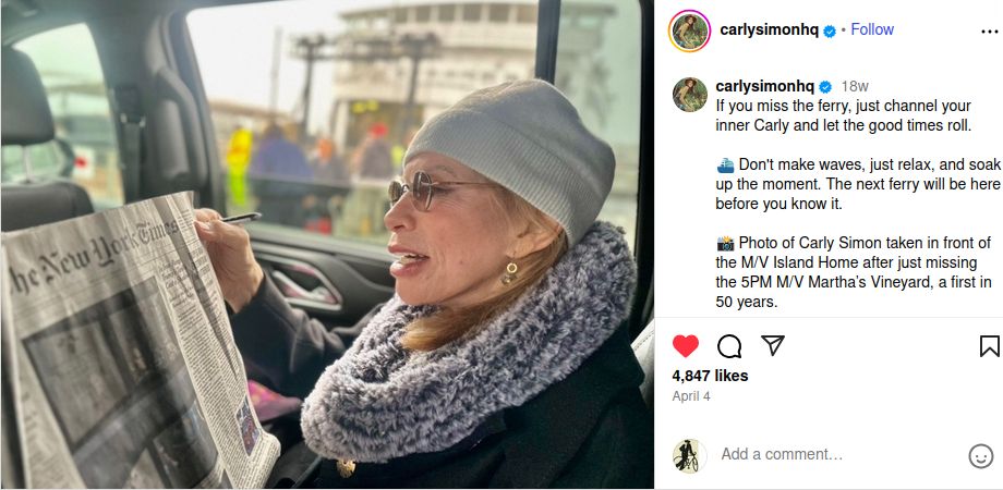 "Photo of Carly Simon taken in front of the M/V Island Home after just missing the 5PM M/V Martha’s Vineyard, a first in 50 years"