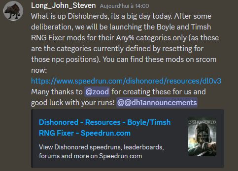 Ca y est sur Dishonored le mod pour enlever l'aléatoire dans le jeu est accepté ! Je vais pouvoir reprendre les runs 🙏
