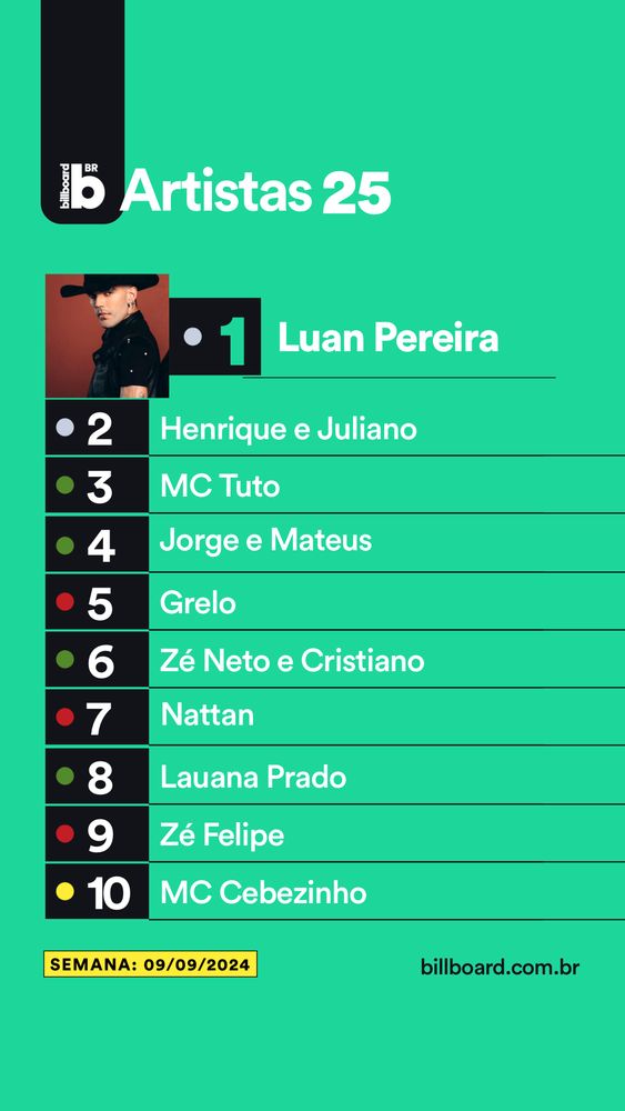 Veja o top 10 da #BillboardBrasilArtistas25 desta semana. (Tabela datada 09/09/2024). Lista completa em nosso site billboard.com.br