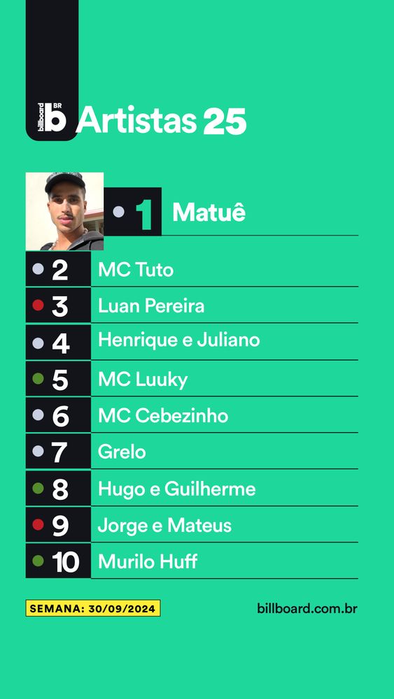 Veja o top 10 da #BillboardBrasilArtistas25 desta semana. (Tabela datada 30/09/2024). Lista completa em nosso site billboard.com.br
