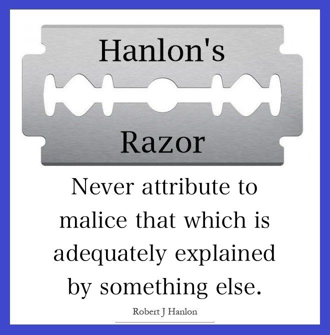 A lot of posts try to explain why the other party is doing something. "This is why Democrats/Republicans did X" or "They're just trying to . . ." Everyone should react to posts like this with extreme skepticism. Apply Hanlon's Razor instead.