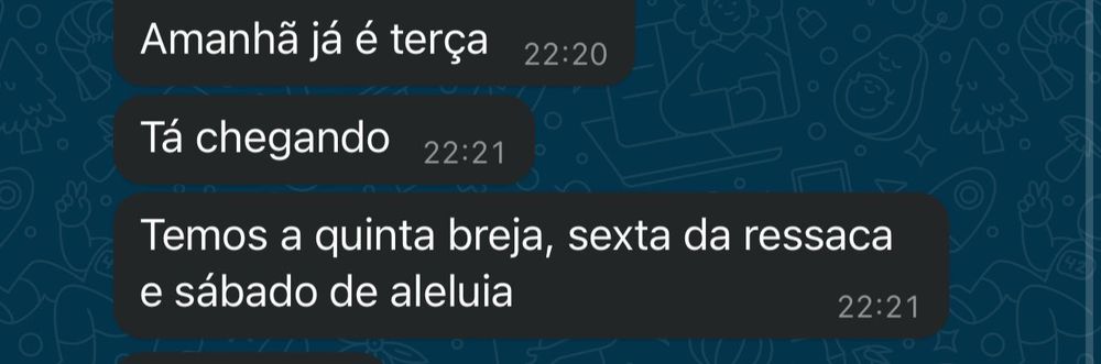 temos a quinta breja, sexta da ressaca e sábado de aleluia