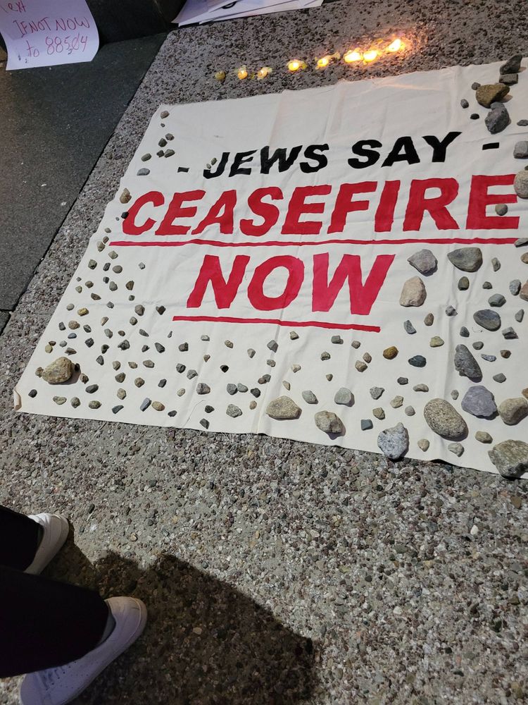 At #ifnotnow rally with, at a guess about 300 others. After another week of drums for war it was heartening to be with other Jews expressing grief but also demanding #ceasefirenow.