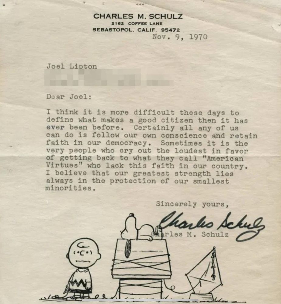 Charles Schulz wrote this letter in reply to a 10-year-old kid who had written and asked, “What makes a good citizen?” Although this letter was written in 1970, almost 54 years to the day, it very much reads as if it could have been written today. (Lifted from Jay Kuo)