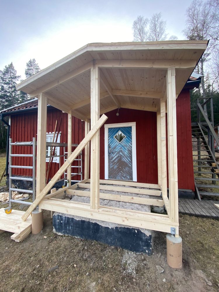 Snickarna har gjort sitt och idag la jag ditt ett temporärt golv. Blir fin fikaplats sen när vi hittat fönster o dörrar och fått dit panel o färg.