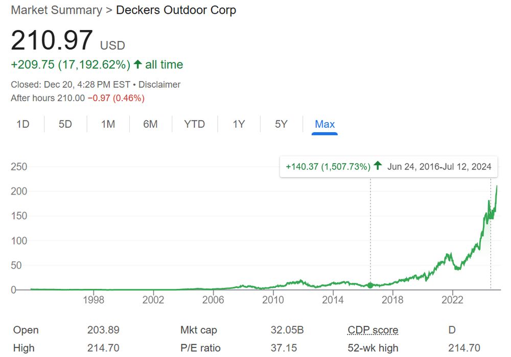 Extremely impressive business transformation at Deckers: from mostly wholesale channel to wholesale + DTC. Also growth at HOKA helped a lot. Pulled off by Dave Powers.