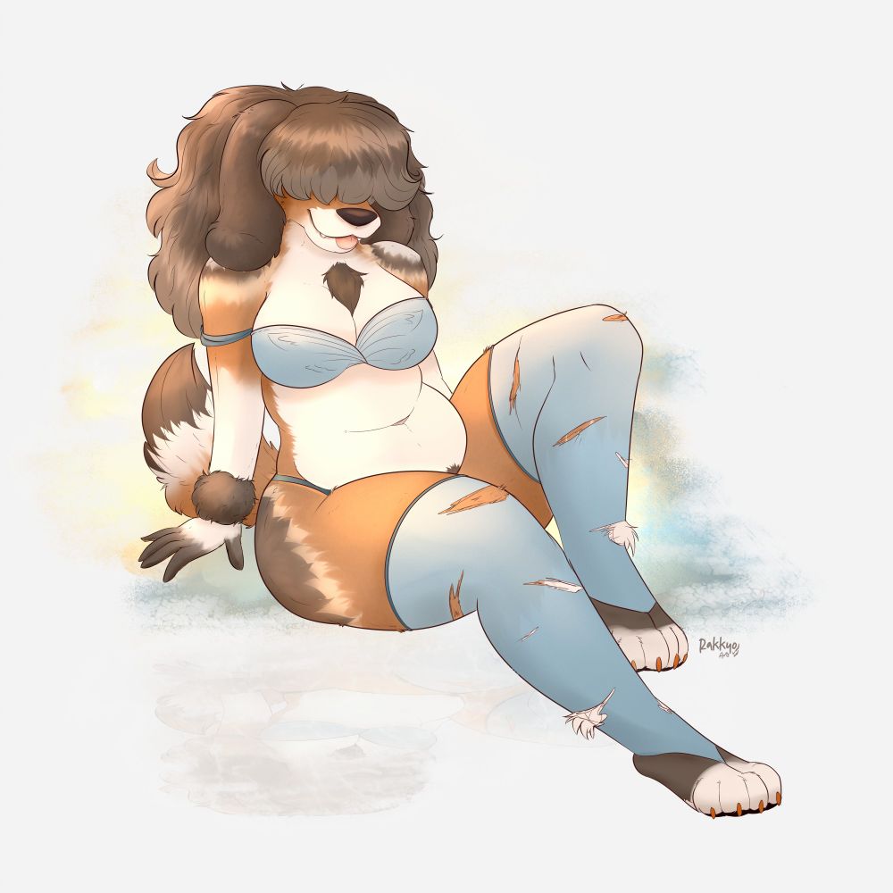 I'll throw up my doggo Maggy, the main character of a fantasy story (with lewd elements) I'm (slowly) writing! She explores and travels for treasure and adventure. She could be enjoying some downtime at the beach in a cute bikini or sundress?