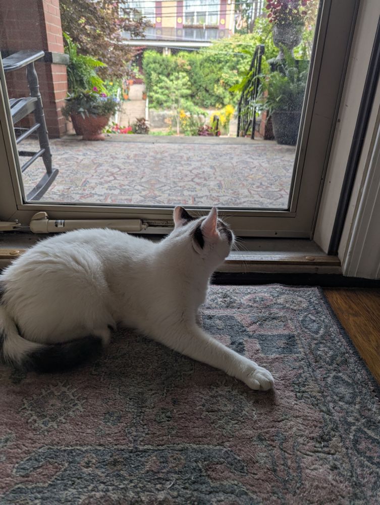 Weller in his doorwindow keeping a close watch on our porch visitors.
