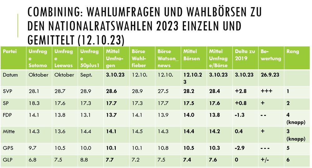 Drei Umfrageserien und zwei Wahlbörsen sind 10 Tage vor den Nationalratswahlen auf den neuesten Stand zu den Parteistärken in der Schweiz gebracht worden. Was besagen sie insgesamt und einzeln. Mein #frischgebloggt. www.zoonpoliticon.ch/blog/26672/2...