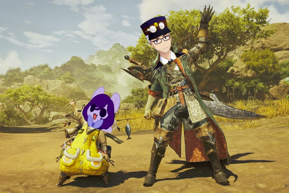 I'm showing my squirreliest friend @gmhina.bsky.social the ropes in Monster Hunter Wilds tonight on the purple platform!