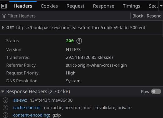 For whatever reason, Passkey's web site serves this font file with a `no-store` policy, meaning it has to be re-downloaded with every page view. Despite it being 29 kB, it takes almost half a second for the server to respond...