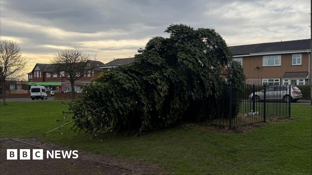 The tree in Shotton Colliery, County Durham, was believed to have been deliberately felled at ~23:20 GMT on Wednesday, Durham Police said, just hrs after the Christmas lights switch-on